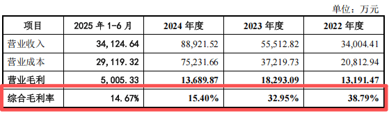 与此同时,公司综合毛利率呈现断崖式下滑,从2022年的38.79%降至2024年的15.40%,2025年上半年进一步降至14.67%。