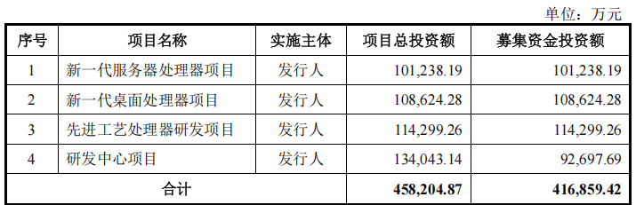 兆芯集成本次IPO计划募资41.69亿元,投向新一代服务器处理器项目、新一代桌面处理器项目、先进工艺处理器研发项目和研发中心项目。