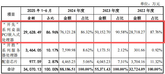 从其业务结构来看,严重依赖桌面处理器收入,2022年至2024年,“开先”系列桌面PC/嵌入式处理器收入占主营业务收入的比例分别约为87.76%、90.58%和86.32%。