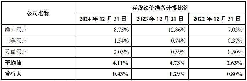 报告期内,海圣医存货跌价准备计提比例略低于同行业平均水平。具体来看,维力医疗存货跌价准备的计提比例较高,主要系为保持原材料供应稳定并保障对客户及时交货,维力医疗在2021年加大了存货储备,该部分存货尚未完全消化,维力医疗针对库龄在1年以上的存货,计提较高跌价准备。在剔除这家可比公司后,报告期内同行业存货跌价准备的平均计提比例为0.44%、0.67%和1.79%,与公司相比不存在重大差异。公司根据企业会计准则的要求对存货进行减值测试并计提跌价准备,报告期内公司存货计提跌价准备金额分别为33.49万元、16.08万元和25.18万元,存货减值金额较小。