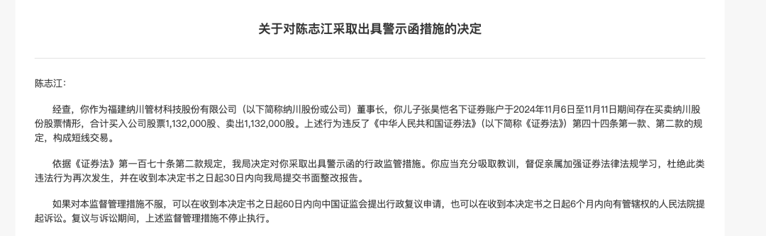 不仅是前妻操纵股票,福建证监局在2024年12月31日发布公告,陈志江因其子张昊恺名下证券账户在2024年11月6日至11月11日期间进行短线交易,受到出具警示函的监管措施。具体来说,张昊恺在此期间合计买入和卖出纳川股份股票各113万股,违反了《证券法》第四十四条的相关规定。