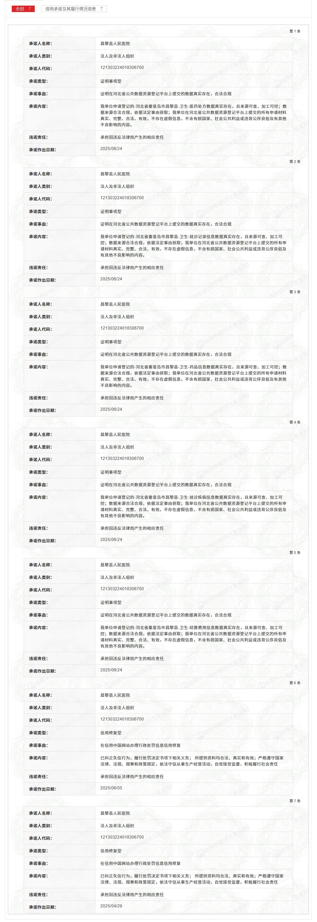 另据信用中国(河北秦皇岛)官网“信用承诺”栏目信息,2025年6月24日,昌黎县人民医院曾发布7项承诺,内容包括:申请登记的医药处方数据、就诊记录信息、药品信息、疾病信息、结算费用信息等均真实存在且来源合法合规;承诺在河北省公共数据资源登记平台提交的所有申请材料真实、完整、合法、有效,不包含虚假信息,不涉及损害国家与社会公共利益或违背公序良俗等内容。