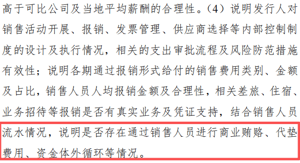 交易所两轮问询均直指核心:“说明是否存在通过销售人员进行商业贿赂、代垫费用、资金体外循环等情况”。