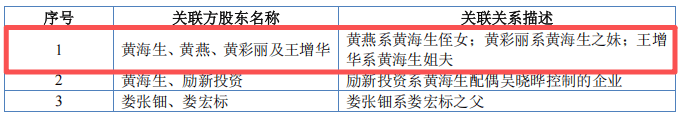 黄燕(黄海生侄女)持股11.72%并担任公司董事;黄彩丽(黄海生妹妹)持股4.69%;王增华(黄海生姐夫)持股2.34%并担任公司行政部职员。