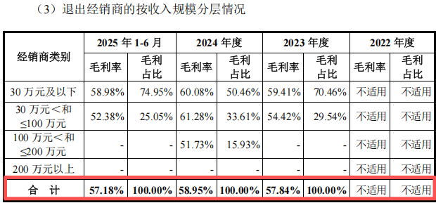 更令人费解的是,2023年-2025年上半年,退出经销商的毛利率(57.84%、58.95%、57.18%)反而高于整体水平。