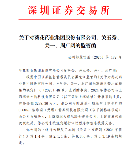 探针财经从深圳证券交易所官网获悉,2025年10月31日,深交所对葵花药业集团股份有限公司及相关责任人下发监管函(公司部监管函〔2025〕第182号),指出该公司在2024年与上海海维生物科技有限公司的采购交易中,未按规定履行审议程序及信息披露义务,构成关联交易违规。