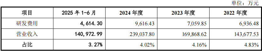 2022年至2024年,公司研发费用占营业收入之比分别为4.83%、4.16%、4.02%,研发投入比重持续下滑。