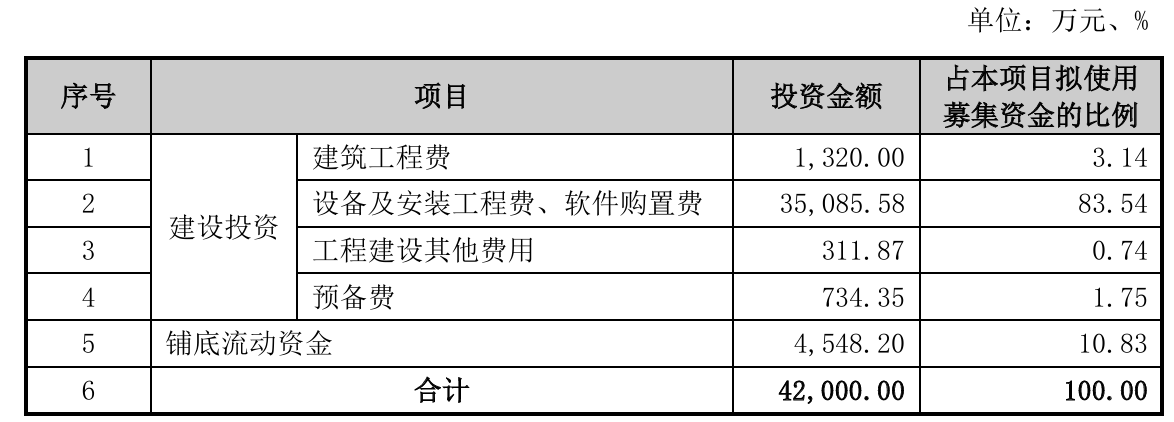 该项目投资金额主要用于设备及安装工程费、软件购置费,占本项目拟使用募集资金的比例为83.54%。