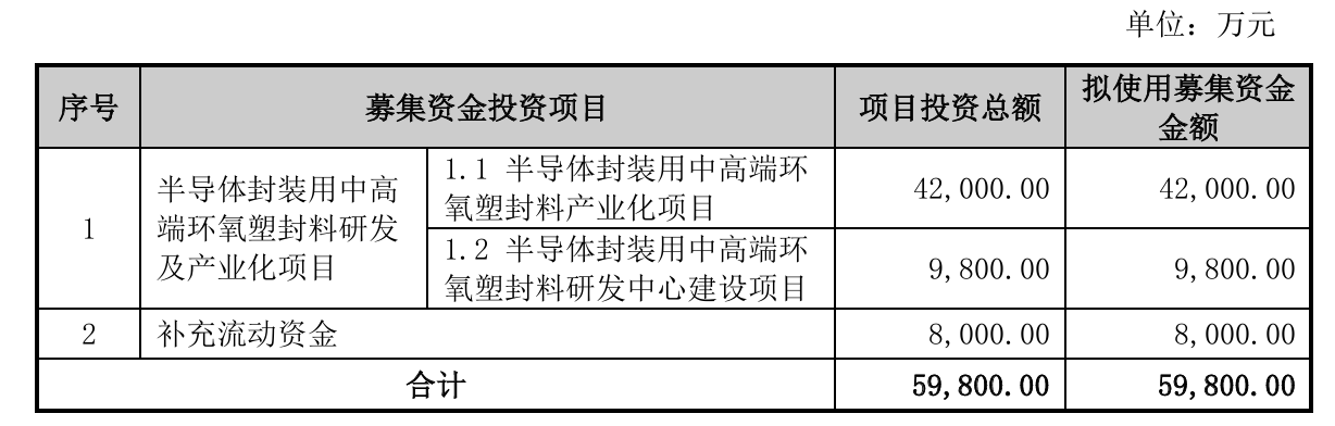 据介绍,半导体封装用中高端环氧塑封料产业化项目为募集资金主要投资内容,拟利用现有厂房建设先进生产线,预计建成后实现年产2.25万吨中高端环氧塑封料的生产能力。