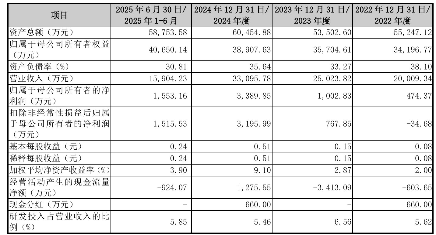 2022年至2024年及2025年上半年(下称“报告期”),中科科化营业收入分别为2亿元、2.5亿元、3.31亿元及1.59亿元;归母净利润分别为474.37万元、1002.83万元、3389.85万元及1553.16万元。