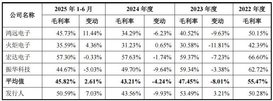 2022年-2025年1-6月,公司综合毛利率分别为50.28%、53.49%、43.56%和50.59%。其中,电子元器件业务毛利率分别为67.91%、65.83%、54.90%和58.52%,精密零组件业务毛利率分别23.26%、22.67%、19.69%和25.16%。宏明电子精密零组件产品毛利率2024年下滑主要系当期因产品质量问题导致客户质量索赔,进而调减收入所致。