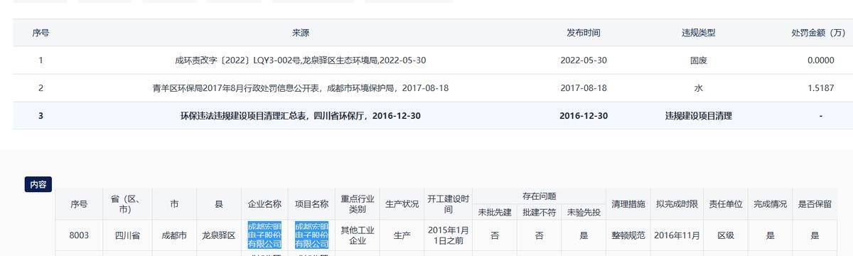 据成青环罚字〔2017〕39号文件显示,宏明电子于2017年8月10日因废水超标被处以罚款1.51875万元。2016年还存在未验先投被要求进行违规建设项目清理。