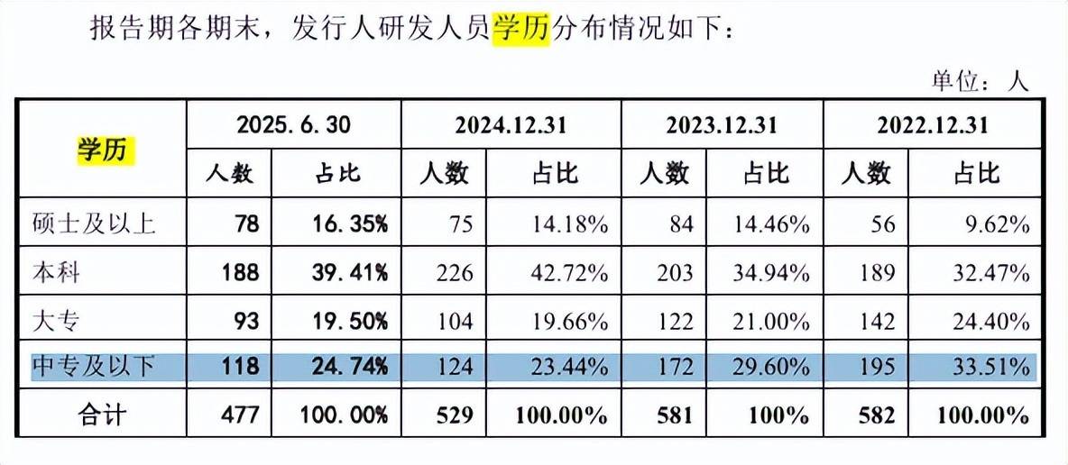 报告期各期末,公司研发人员数量分别为582人、581人、529人和477人,其中大专及以上学历人数占比分别为66.49%、70.40%、76.56%和75.26%,中专及以下学历人数分别为195人、172人、124人和118人,占比33.51%、29.60%、23.44%和24.74%,前期学历较低的研发人员数占到了1/3。