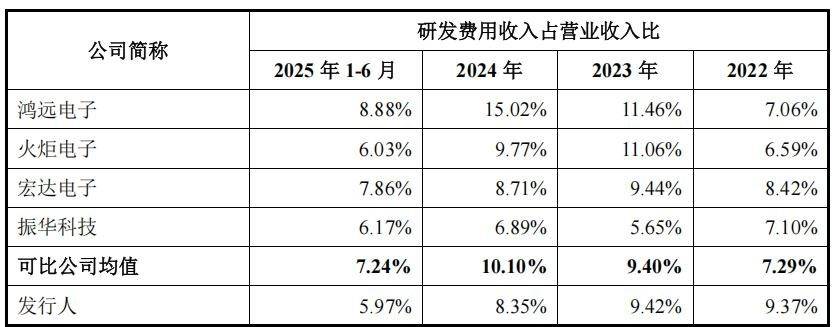 2024年及2025年1-6月,宏明电子研发费用率低于可比公司平均水平。从2022年还高于可比同行均值2个点,到反低于同行均值2个点,2025年上半年仅5.97%。