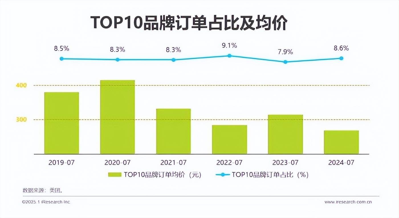 根据艾瑞咨询发布的《2024按摩足疗行业白皮书》,按摩足疗行业的市场规模连续三年增长,预计2025年将达到7000亿元,商户数量急剧增加,与此同时,TOP10品牌订单占比却始终保持在8.5%左右,且其客单价因消费降级、竞争加剧等因素从400元左右下降至不到300元,也就是说,该行业并未形成较强的品牌效应。