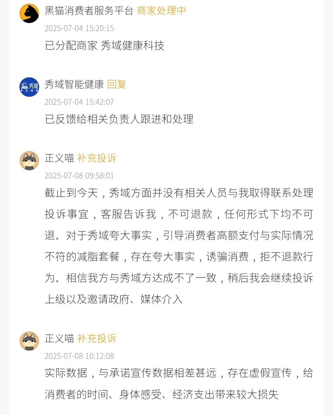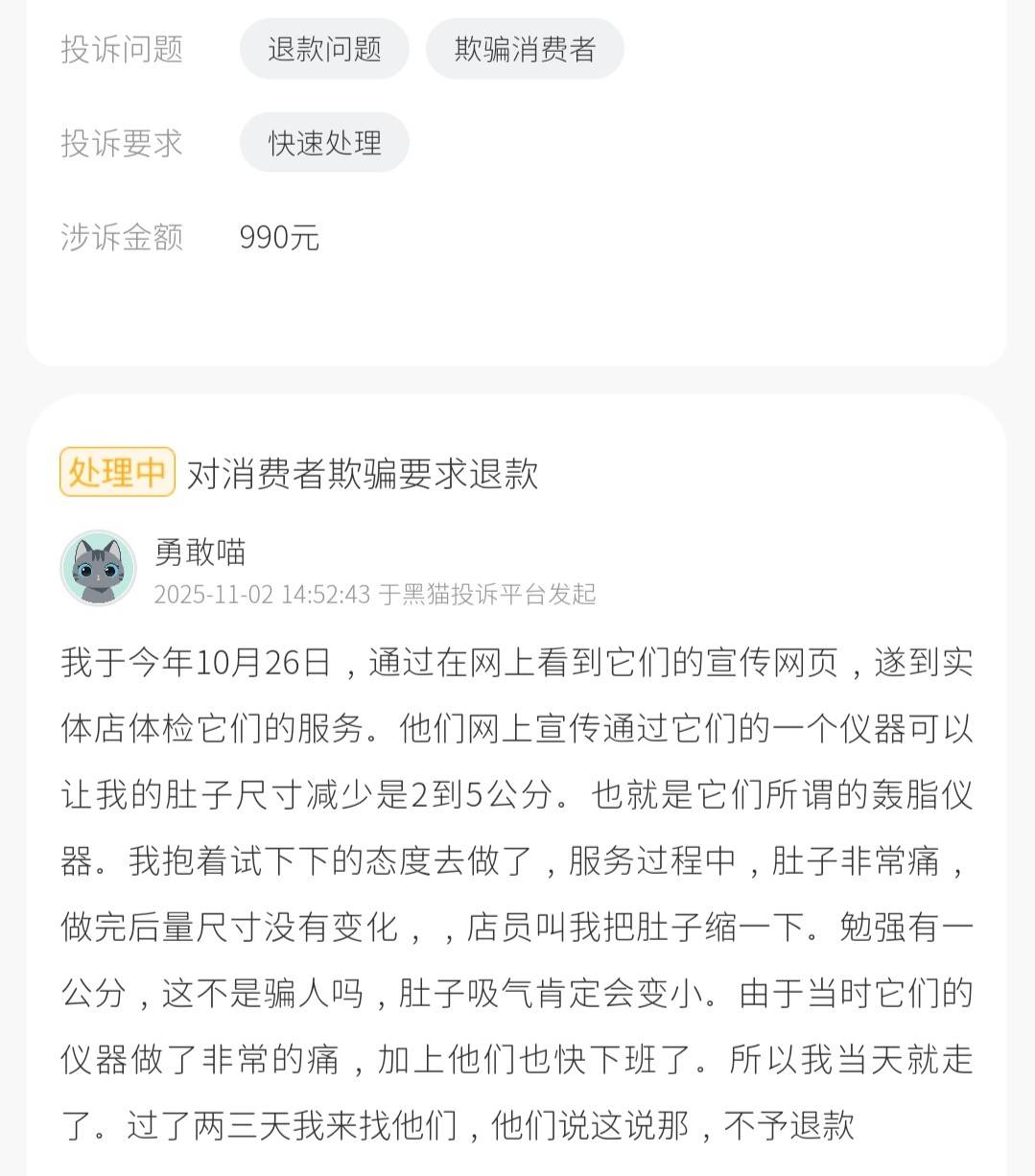 11月2日,黑猫投诉平台有消费者对秀域健康科技发起投诉,该消费者称,其于10月26日在网上看到秀域宣传网页,宣称使用“轰脂仪器”可使肚子尺寸减少2至5公分,遂前往实体店体验。服务过程中,该消费者感到肚子非常疼痛,做完后测量尺寸无变化,店员让其收腹后勉强显示减少1公分。该消费者认为此举涉嫌欺骗,因吸气收腹本身就会使肚子变小。由于当时仪器操作疼痛且门店临近下班,其当天未继续交涉,两三天后返回要求退款,被门店以各种理由拒绝,至今未退还990元费用,故在平台要求快速处理并退款。截至深度美业发稿前,该投诉显示已经匹配到商家,但仍显示在处理中状态。