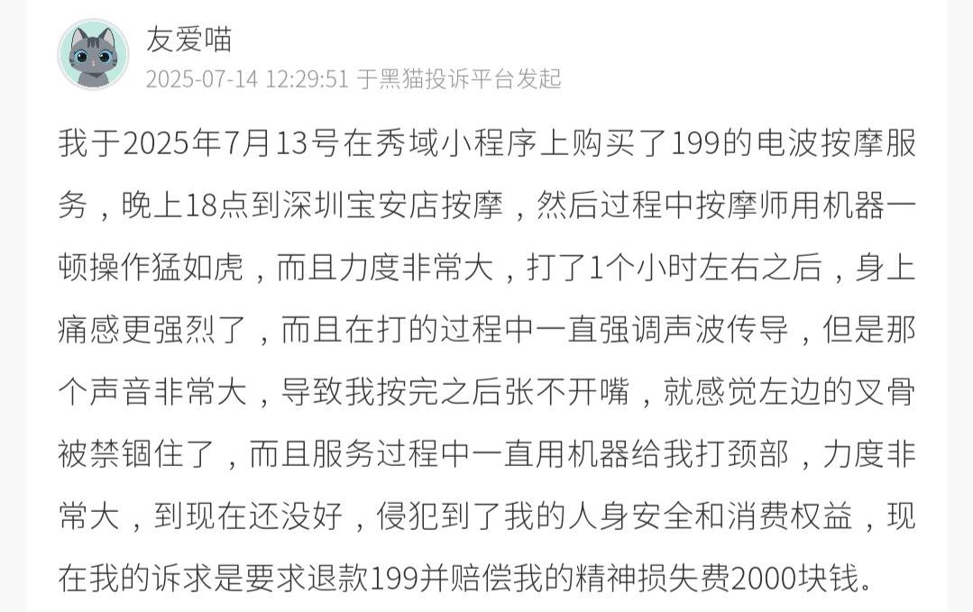 7月14日,黑猫投诉消费者表示,其于7月13日在秀域小程序购买199元电波按摩服务,当晚18时在深圳宝安店接受按摩,按摩师使用机器操作力度极大,持续约一小时,过程中强调声波传导但声音刺耳,导致按摩后身体痛感加剧、左侧颌骨活动受限且至今未缓解,认为人身安全与消费权益受到侵害,要求退还199元并赔偿精神损失费2000元。