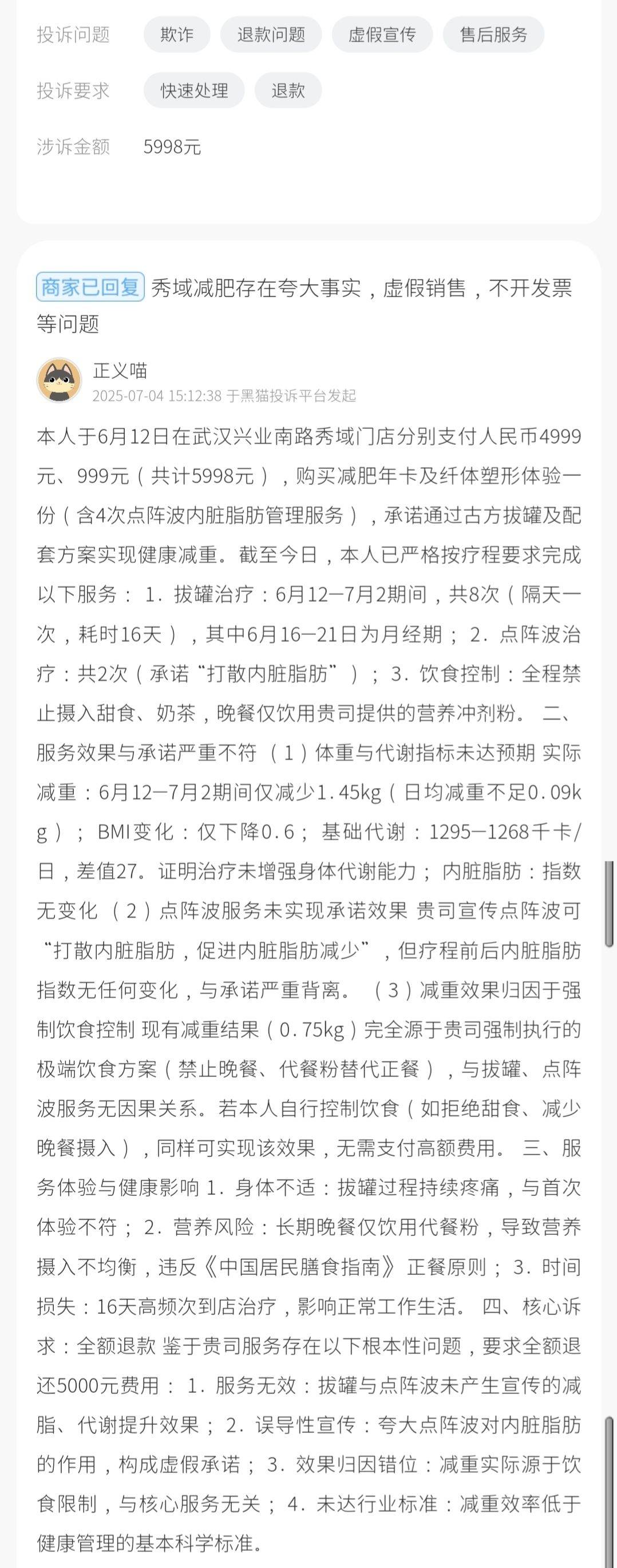 7月4日,黑猫投诉平台的消费者对该机构武汉门店,发起投诉,称该消费者于6月12日在武汉兴业南路秀域门店先后支付4999元与999元共计5998元,购买减肥年卡及包含四次点阵波内脏脂肪管理的纤体塑形体验,门店承诺借助古方拔罐与配套方案实现健康减重,至7月2日该消费者已严格按照隔日一次的频率完成八次拔罐(6月16至21日月经期暂停)与两次号称“打散内脏脂肪”的点阵波治疗,并全程遵守禁食甜食奶茶、晚餐仅饮用门店营养冲剂粉的饮食规定。