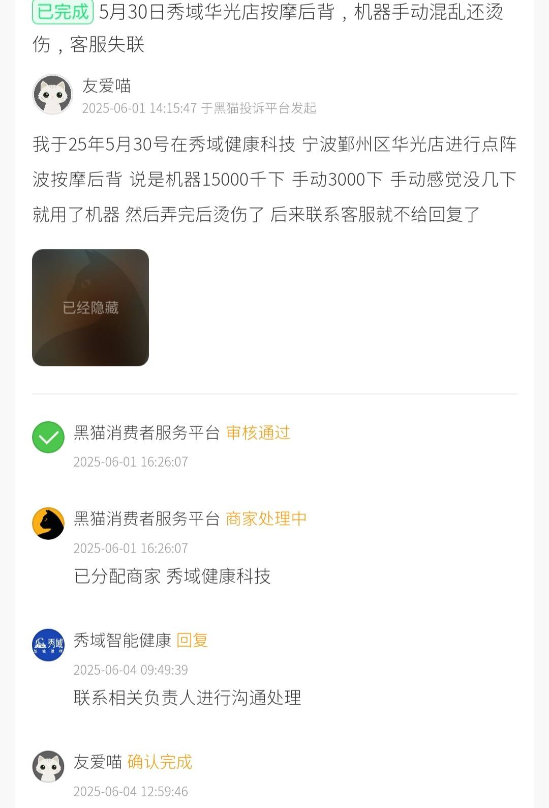 更有消费者声称,服务过程中被仪器烫伤。6月1日,该消费者称,其于5月30日在秀域健康科技宁波鄞州区华光店接受点阵波后背按摩,门店原承诺“机器15000下、手动3000下”,实际却几乎全程使用机器,且操作结束后发现背部已被烫伤,随后多次联系客服均未获回复,遂要求平台介入。