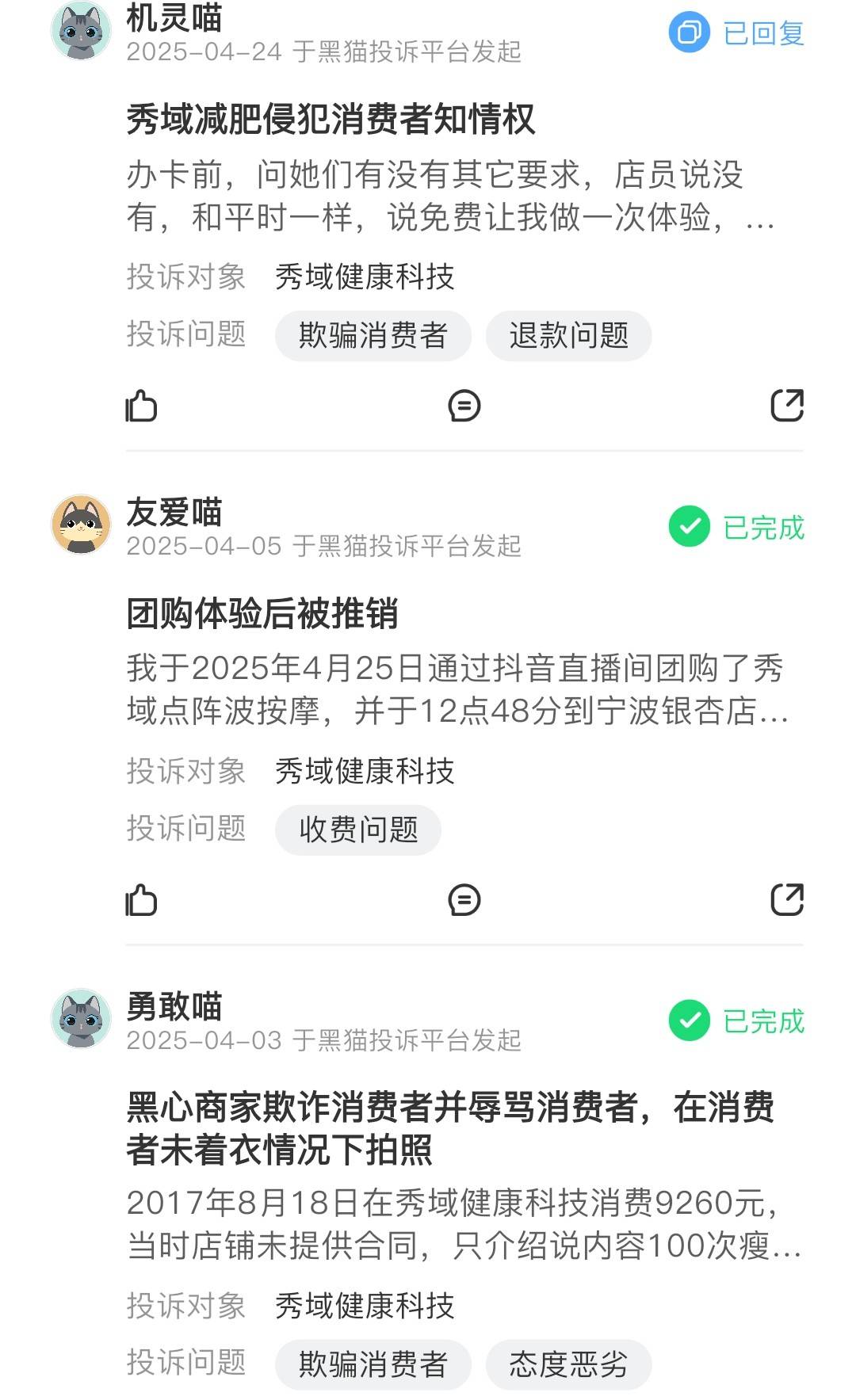 与传统美体养生门店一样,秀域各地门店也存在着传统门店多发的消费投诉问题,包括消费者认为知情权被侵犯、体验后被推销以及个人隐私泄露等问题。