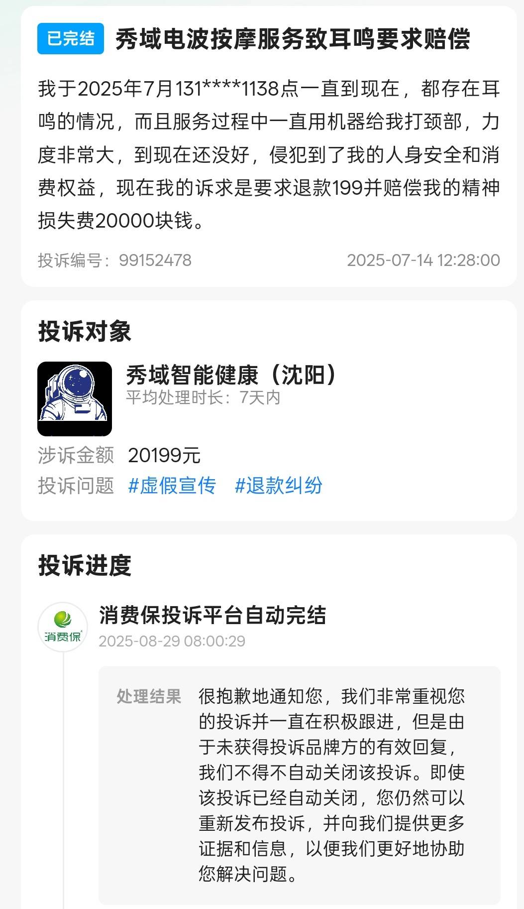 7月14日,消费保上的一则投诉显示,该消费者称7月13日8点在秀域智能健康沈阳店接受电波按摩服务,工作人员用机器大力击打其颈部,过程中出现耳鸣,至今症状未缓解,消费者认为自身人身安全与消费权益受到侵害,要求退还199元服务费并赔偿精神损失费20000元,涉诉金额合计20199元。截至深度美业发稿前,平台跟进后因未收到品牌方有效回复,投诉于8月29日被系统自动完结。
