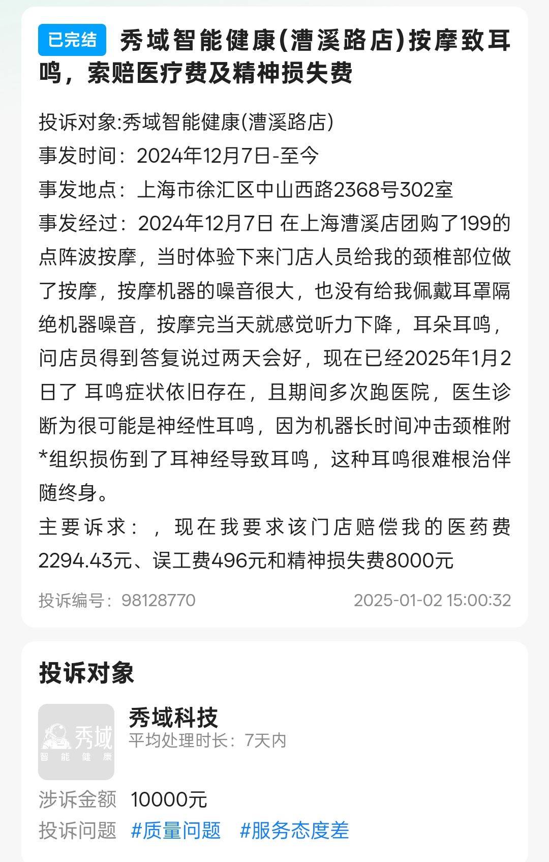 今年1月,有消费者称,其于2024年12月7日在上海漕溪店团购199元点阵波按摩,门店未提供耳罩隔绝噪音,按摩后当日即感听力下降、耳鸣;2025年1月2日投诉页面记录,医院诊断为“很可能是神经性耳鸣”,认为系机器长时间冲击颈椎附近组织损伤耳神经,并提示该耳鸣难以根治、可能终身伴随。该消费者要求门店赔偿医药费2294.43元、误工费496元、精神损失费8000元,合计10000元。