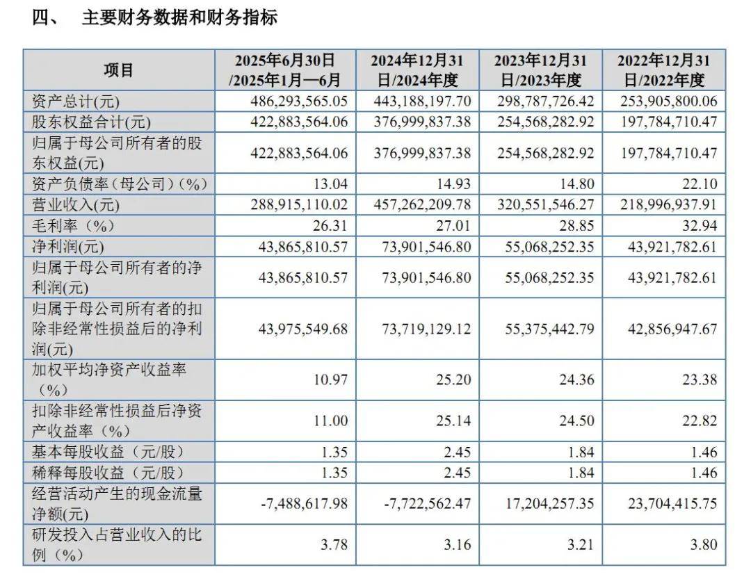 然而,业绩一路“高歌猛进”的背后,公司的毛利率却逐年走低,经营性现金流更是在去年突然转为负值。招股说明书显示,2022年至2025年上半年,公司的毛利率分别为32.94%、28.85%、27.01%和26.31%,累计降幅达6.63个百分点,主营业务毛利率分别为33.02%、31.36%、30.09%和 31.53%。