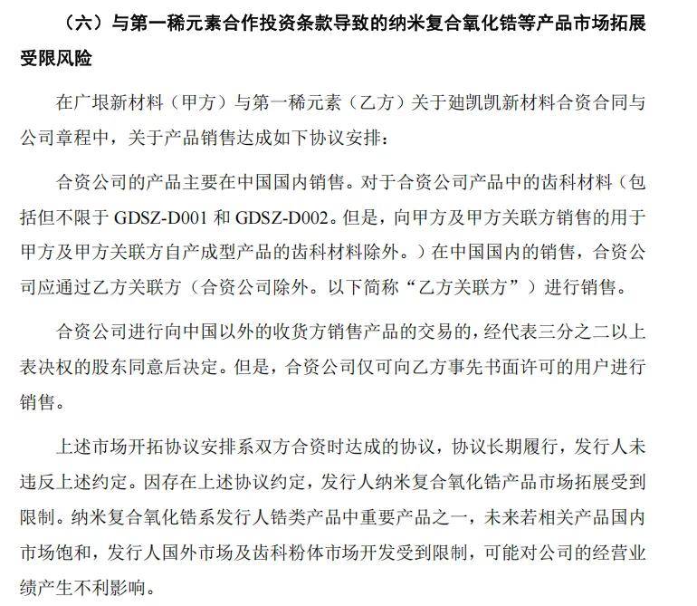 根据广垠新材料(甲方)与第一稀元素(乙方)就廸凯凯新材料合资事宜签订的合资合同与公司章程中,对产品销售作出如下安排:合资公司的产品主要面向中国国内销售,其中齿科材料在中国国内的销售必须通过第一稀元素的关联方进行,而若合资公司拟向中国以外的收货方销售产品,则需经代表三分之二以上表决权的股东同意,且仅可向第一稀元素事先书面许可的用户进行销售。长裕集团在招股书中称,这一安排使得长裕集团在纳米复合氧化锆产品的市场拓展上受到限制,未来若相关产品国内市场饱和,长裕集团国外市场及齿科粉体市场开发受到限制,可能对公司的经营业绩产生不利影响。