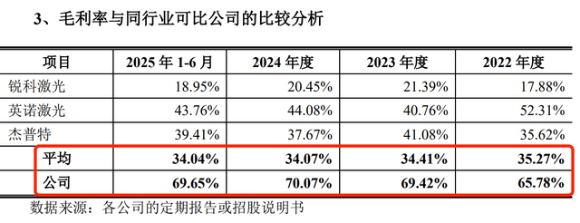 从营收与净利润数据来看,频准激光毛利率可谓是极高。公司在2022年至2025年上半年的毛利率分别为 65.43%、68.53%、67.78%和 69.96%。从同行业可比公司来看,锐科激光、英诺激光、杰普特三家公司在上述期间的平均毛利率为35.27%、34.41%、34.07%、34.04%,仅仅只有频准激光一半。