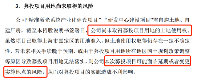 频准激光在招股书披露到,公司“精准激光系统产业化建设项目”“研发中心建设项目”需自购土地、自建厂房,截至本招股说明书签署日,公司尚未取得募投项目用地的土地使用权。虽然项目已取得上海市嘉定区的用地准入,但土地使用权取得仍存在一定不确定性,若未来相关手续晚于预期,或由于募投项目用地所在地区国土规划政策调整 等原因导致募投项目用地无法落实,则公司本次募投项目可能面临延期或者变更实施地点的风险,从而对募投项目的实施造成不利影响。