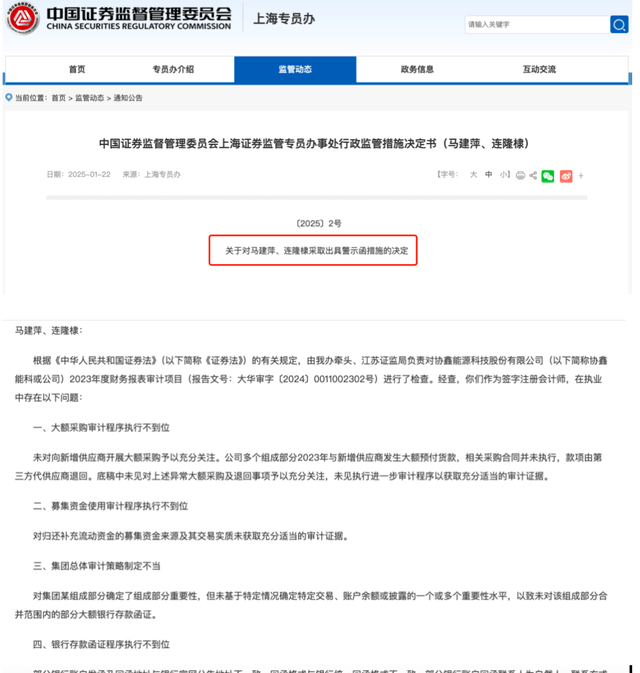 然而,就是同时拥有在大华、安永、立信等国内顶级会计师事务所工作经历的频准激光的独立董事马建萍,确因在协鑫能科当中涉及大额采购审计程序、募集资金使用审计程序、集团总体审计策略制定、银行存款函证程序中执行不到位或制定不当而被监管层采取出具警示函的监督管理措施。