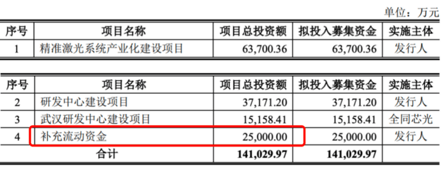 据招股书披露,精准激光此次IPO项目总投资为14.10亿元,主要用于系统产业化建设项目、研发中心建设项目、武汉研发中心建设项目、补充流动资金,所需资金全部来源于募投项目。其中补充流动资金就达到了2.5亿元,而一边分红一边巨额募资补流也成为争议的焦点。