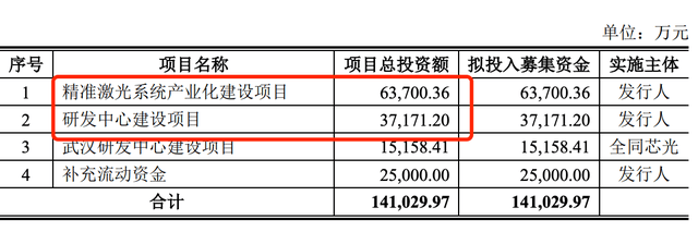 据招股书披露,频准激光此次IPO募投项目总金额达到了14.10亿元,主要用于系统产业化建设项目、研发中心建设项目、武汉研发中心建设项目、补充流动资金。其中投资最大的就是“系统产业化建设项目、研发中心建设项目”这两个项目,分别募资金额为6.37亿元和3.72亿元,合计金额达到了10.09亿元,占整个募投募资金额比重达到了71.56%。