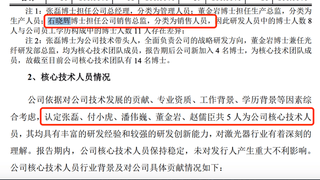 招股书显示,张磊为公司实际控制人、董事长及总经理,在员工持股平台持有最大比例属情理之中,但第二和第三位的石晓辉和李利军持股比例均为12.9938%,却并不在公司的核心技术人员或董事会管理层当中。其中,石晓辉博士担任公司销售总监,目前分类为销售人员。而李利军除了在员工持股平台上海光团担任第三大合伙人之外,在公司没有任何高层职位,也不是核心技术人员。