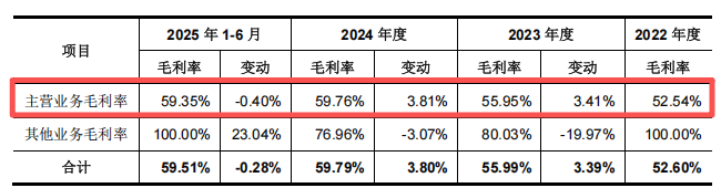 公司报告期内(2022-2024年)营收与净利润高速增长,主营业务毛利率从52.54%攀升至59.76%,显著高于行业可比公司。然而,高毛利的光环下,是主营业务结构性的隐忧。
