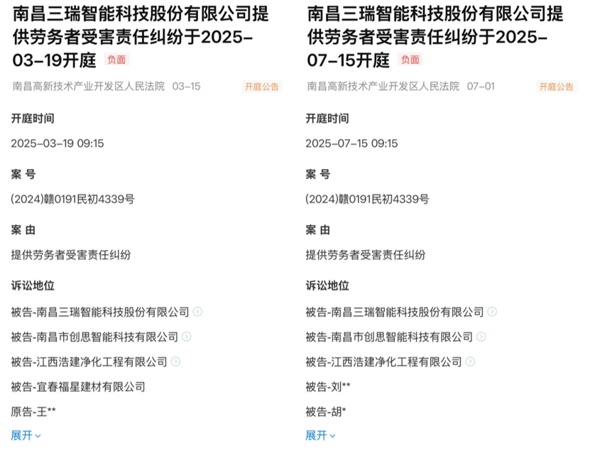 除了业务与财务层面的隐忧,公司内部管理与风险控制同样露出了破绽。根据招股书“重大诉讼或仲裁事项”一节披露,报告期内公司曾涉及一起劳务者受害责任纠纷。该案件虽已于2023年一审判决后调解结案,公司也已履行赔偿义务,但事件本身值得深究。值得注意的是,据公开信息显示,在IPO审核期间的2025年3月和7月,公司又分别被王某、刘某及胡某等多名个人以“提供劳务者受害责任纠纷”为由提起诉讼。若该情况属实,则表明相关问题并非孤立的历史事件,而是可能暴露出持续且严重的系统性管理漏洞。