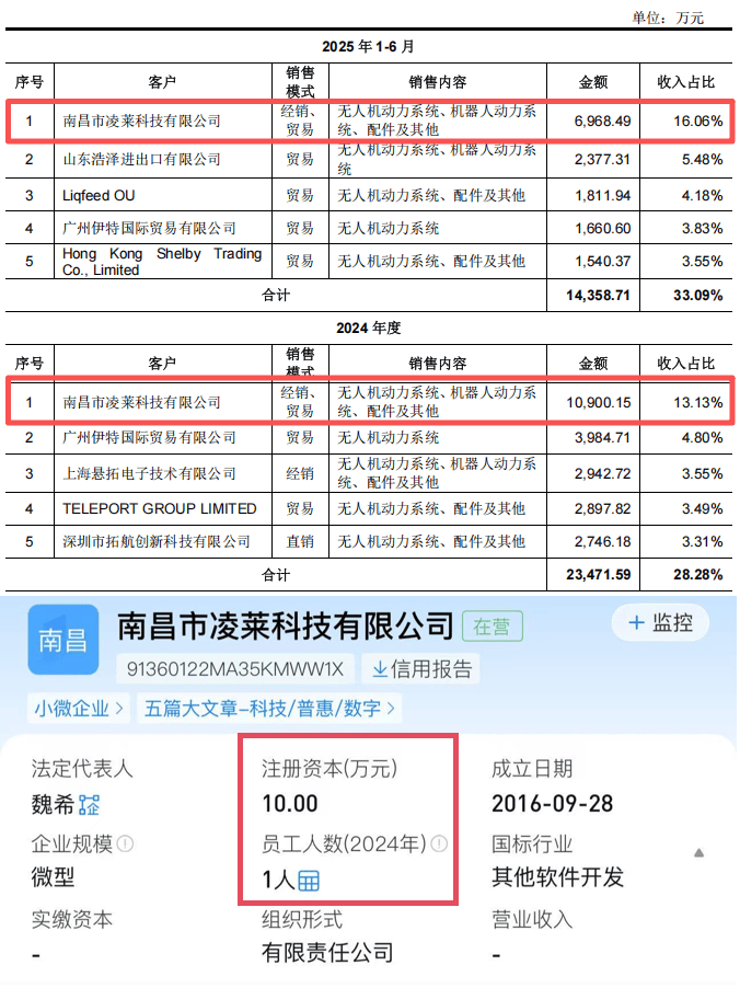 其次,高毛利可能源于与“非主流”客户的交易。 更深的隐患在于市场定位。尽管公司宣称产品覆盖全球主流无人机厂商,但2024年其对35家全球主流无人机厂商的平均交易额仅约85.83万元。与此形成鲜明对比的是,公司24年和25年第一大客户仅是注册资本10万元的小微企业。这表明,公司的高增长和高毛利,可能很大程度上依赖于分散且非头部的“长尾”客户,而非与行业巨头深度绑定。这种业务模式在行业上升期可行,但一旦市场波动或巨头供应链策略调整,其业绩的脆弱性将暴露无遗。