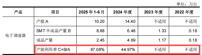 首先,核心产品产能利用严重不均,募资扩产合理性存疑。 公司计划将超半数募集资金(4.1亿元)用于扩产。但招股书显示,其核心产品电子调速器(电调)的产能利用率长期低迷,2024年仅为44.97%,即超过一半的产能处于闲置状态。在自有产能大量闲置的背景下,仍计划巨额募资扩产,其必要性与未来产能消化能力令人生疑。