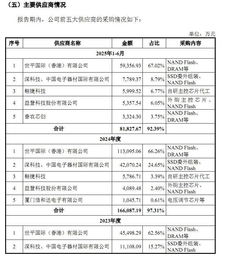 不仅客户集中度较高,大普微对前五大供应商也较为依赖。2022年至2025年上半年,公司对前五大供应商采购金额分别为8.34亿元、7.00亿元、16.61亿元和8.18亿元,占当期采购总额的比例分别高达98.13%、96.30%、97.31%和92.39%。其中,报告期内公司对第一大供应商世平国际(香港)有限公司采购金额分别为7.18亿元、4.55亿元、11.31亿元和5.94亿元,采购占比分别为84.49%、62.56%、66.26%和67.02%,存在向单一供应商采购占比超过50%的情形。