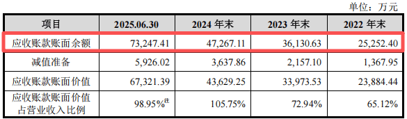“纸面富贵”的根源直指急速增长的应收账款。截至2025年6月30日,公司应收账款账面余额已攀升至7.32亿元,较2024年末的4.73亿元增长超过56%,占当期营业收入的比例异常偏高。