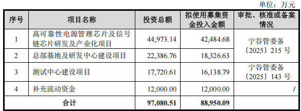 展芯半导体本次IPO计划募集资金主要用于四个项目:“高可靠性电源管理芯片及信号链芯片研发及产业化项目”、“总部基地及研发中心建设项目”、“测试中心建设项目”和“补充流动资金”。