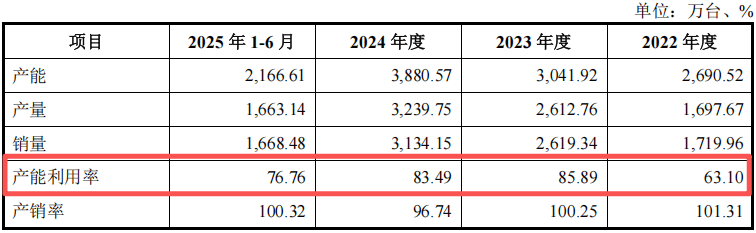然而,监管问询函直指一个核心矛盾:报告期内,公司主要产品的产能利用率已从2023年的85.89%下滑至2025年上半年的76.76%。
