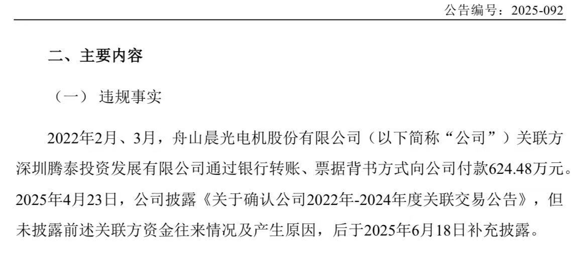 2022年2月至3月期间,公司关联方深圳腾泰投资发展有限公司通过银行转账、票据背书方式向公司支付款项共计624.48万元。对于该笔关联方资金往来,公司未在发生时及时进行信息披露。