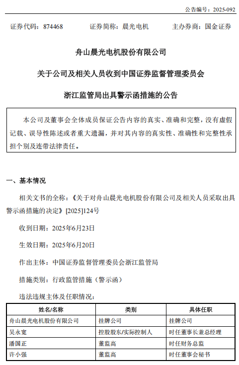 2025年6月24日,中国证券监督管理委员会浙江监管局对公司及相关责任人员采取出具警示函的行政监管措施,并记入证券期货市场诚信档案。
