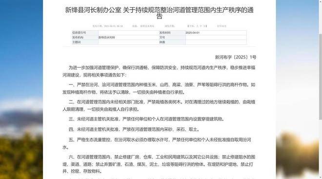新绛县河长制办公室于2025年4月1日也发布了新河布字〔2025〕1号 《关于持续规范整治河道管理范围内生产秩序的通告》的文件,文件内也明确了未经河道主管机关批准,严禁在河道管理范围内采砂、采石、取土的规定。