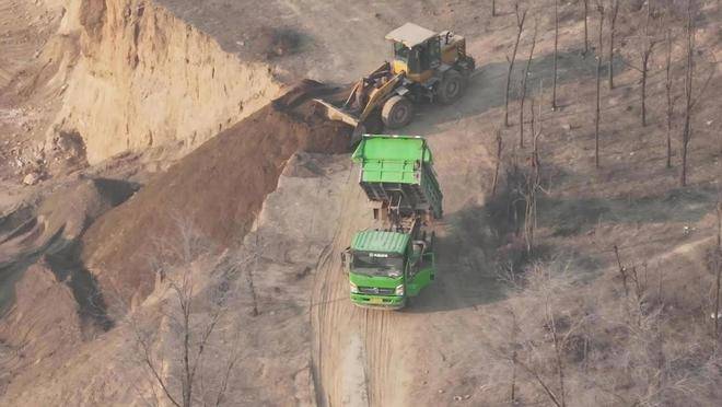 在张庄村汾河段,一辆挖掘机正在河道内采挖河沙,装载至两辆绿色货车上。满载后的货车明显超载,沿村间道路驶向张庄村西北侧一处砂石筛选场地。现场河沙堆积成山,筛分设备持续运转,形成完整的采、运、筛作业链。据观察,运输车辆约每30分钟往返一次,作业频率之高令人震惊。