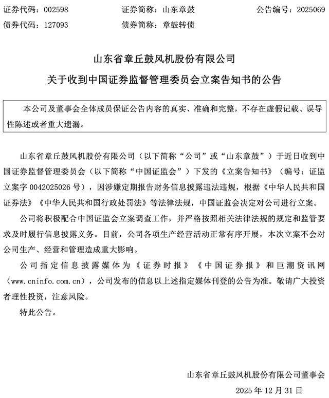 2025年12月31日,山东章鼓(002598)发布公告,公司于近日收到中国证监会下发的《立案告知书》,因涉嫌定期报告财务信息披露违法违规,根据相关法律法规,中国证监会决定对公司进行立案。