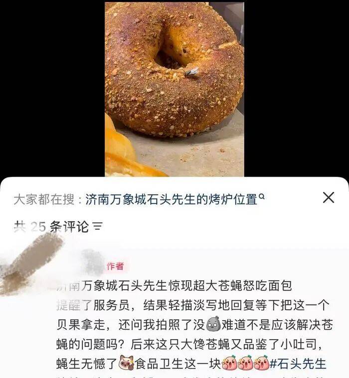 2025年7月27日,在烟台万达“石头先生的烤炉”门店,也有消费者拍摄到一只苍蝇正停留在金黄色的面包表皮上。消费者在配文中表示,原本认为该品牌“超级干净、要求严格”,但眼前的景象与其高端定位形成了强烈落差。
