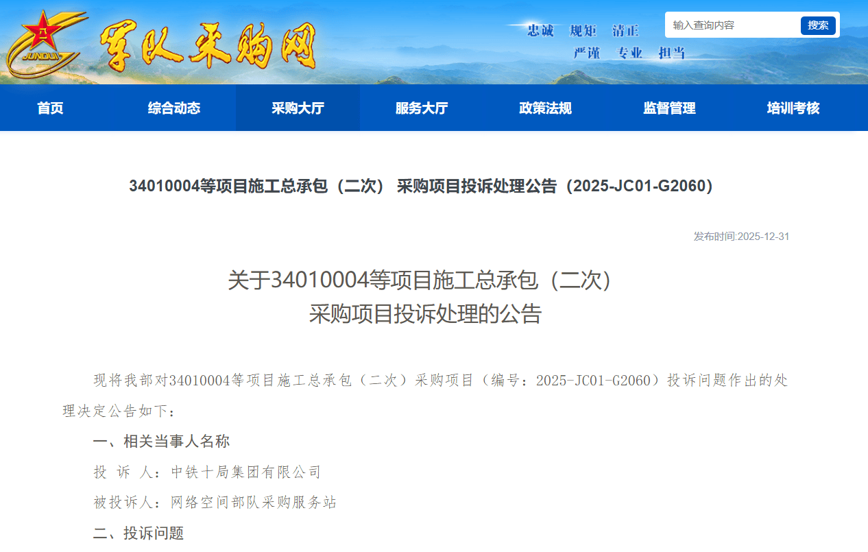近期,军采网发布关于34010004等项目施工总承包(二次)采购项目投诉处理的公告。