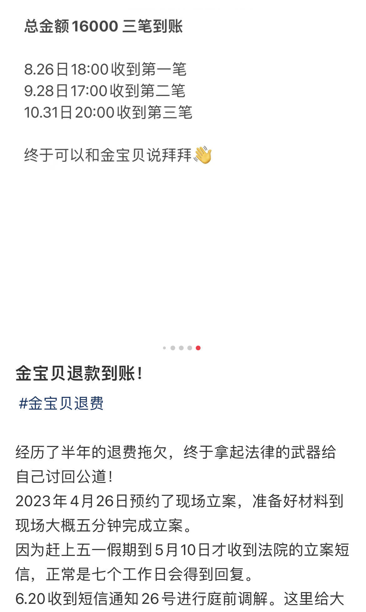 记者在社交媒体平台上查询发现,有多位家长发文表示金宝贝退费困难,还有早前遇到闭店的家长表示,从申请退费到退费到账花费了大半年的时间,这期间还不得已采取司法途径且进一步申请强制执行。